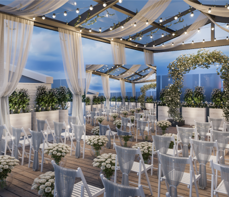 Sky Fourteen Rooftop accommodates gatherings of 50 to 150 guests, making it ideal for weddings, engagement parties, showers, anniversaries, corporate meetings, galas, and holiday celebrations. The space is fully accessible, and convenient attached parking ensures a seamless experience. Our dedicated events team is committed to creating an unforgettable occasion—one that reflects the pinnacle of elegance.