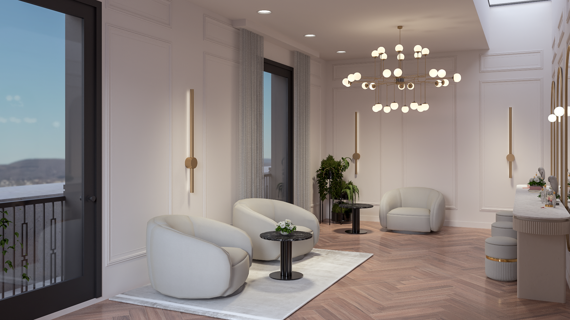 Upon arriving at the top floor, guests are greeted by a stunning river view. Upon entering the ballroom which is adorned with an arched ceiling, preserved wood flooring, and large windows to highlight the incredible views. As they step onto the rooftop terrace for cocktails and hors d’oeuvres, the skyline unfolds before them—a mesmerizing backdrop for any occasion. As the sun sets, the rooftop transforms, casting a magical glow over your event.